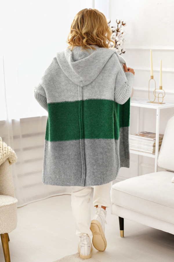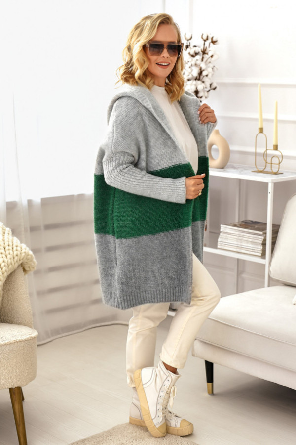 Klasyczny kardigan bez zapięcia wykonany z miękkiego w dotyku materiału to doskonały wybór do wielu stylizacji. Model z kapturem i przeszyciem na plecach. Zakończony długimi ściągaczami.