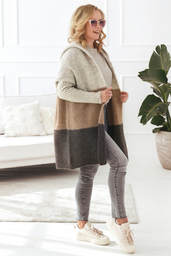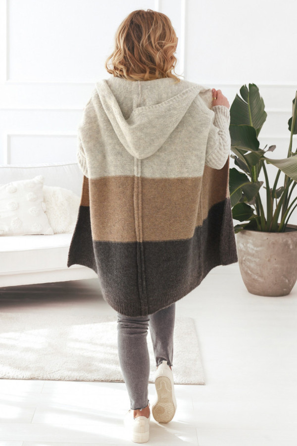 Klasyczny kardigan bez zapięcia wykonany z miękkiego w dotyku materiału to doskonały wybór do wielu stylizacji. Model z kapturem i przeszyciem na plecach. Zakończony długimi ściągaczami.