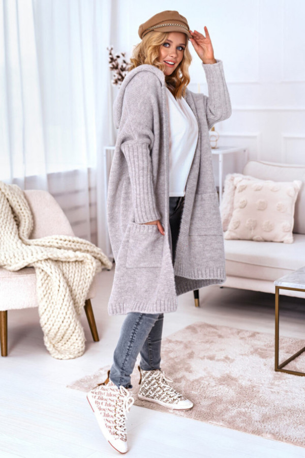 Przyjemny w dotyku kardigan o oversizowym kroju. Oryginalny napis na plecach. Model posiada dwie naszyte kieszenie i obszerny kaptur. Zakończony długimi ściągaczami.