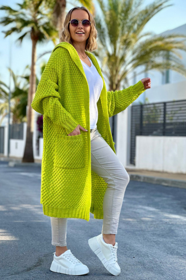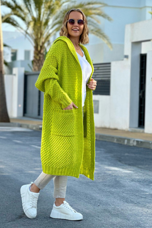 Długi kardigan z kieszeniami i kapturem luise limonka