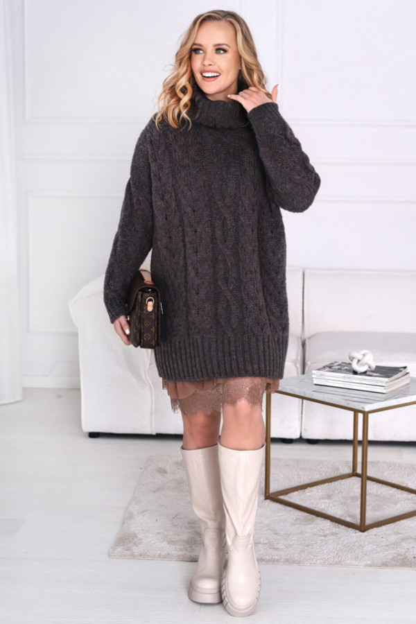 Dłuższy sweter z golfem i ozdobnym splotem. Model zakończony ściągaczem przy rękawach i na dole. Możesz zestawić go z halką lub spodniami i ciężkimi butami – świetna stylizacja gotowa!