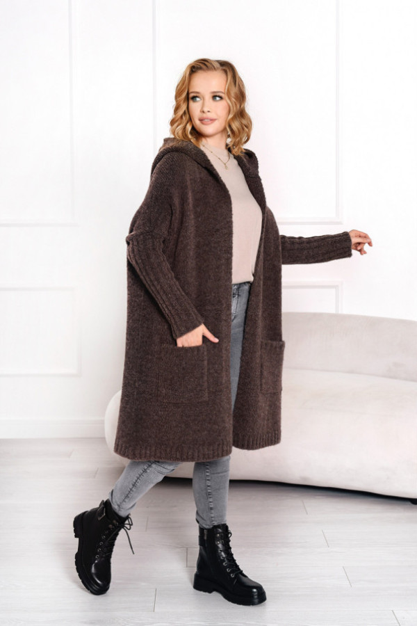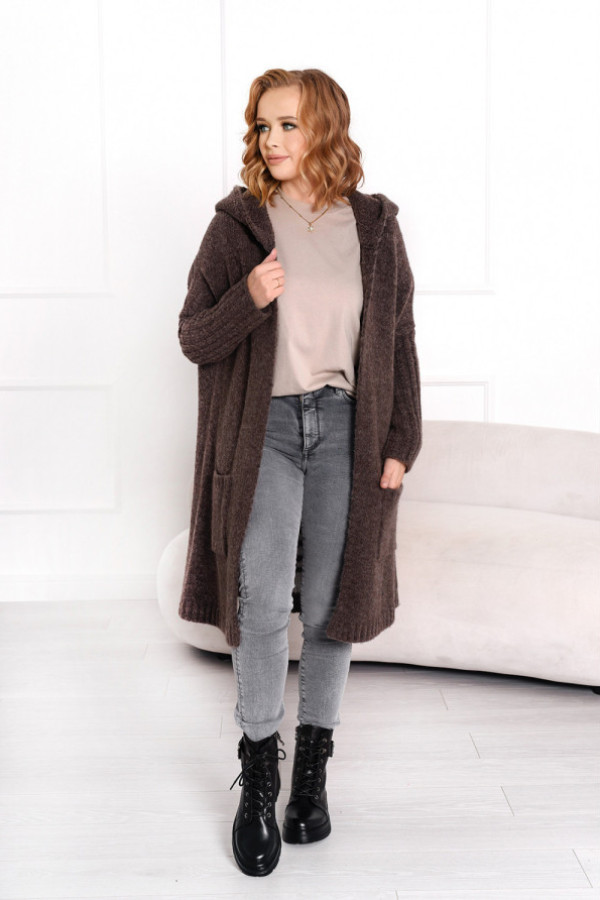 Przyjemny w dotyku kardigan o oversizowym kroju. Oryginalny napis na plecach. Model posiada dwie naszyte kieszenie i obszerny kaptur. Zakończony długimi ściągaczami.