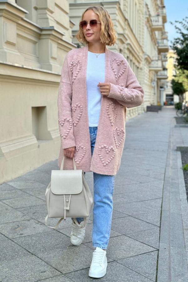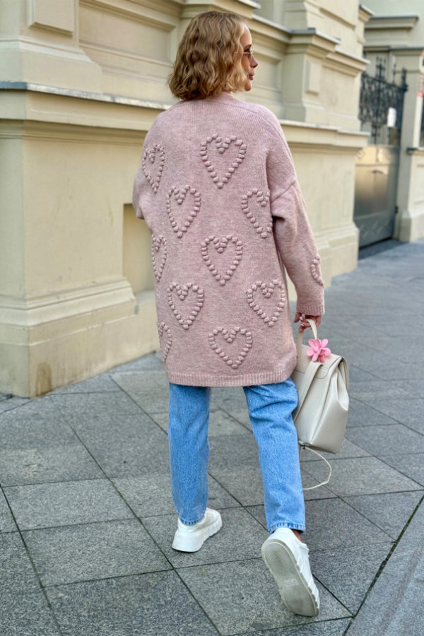 Niepowtarzalny kardigan to propozycja stworzona z myślą o chłodniejszych dniach. Wyróżnia się wypukłymi sercami, co dodaje mu wyjątkowego, romantycznego charakteru. To model o oversizowym fasonie z długimi rękawami, które zakończone zostały ściągaczami.