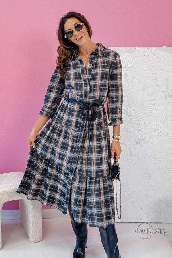 Flanelowa szmizjerka z przwiązaniem - grafitowa w bordową kratę