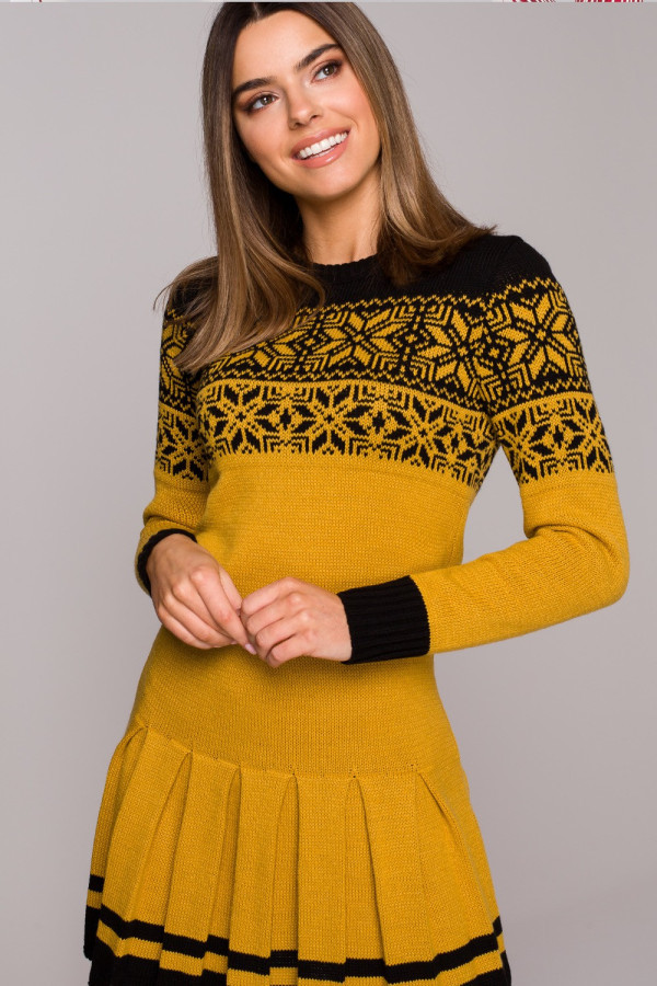 Dzianinowa sukienka o długości mini ze świątecznym motywem oraz kontrafałdą. Model dwukolorowy, posiada wzór norweski, który doskonale wprowadzi Cię w atmosferę zimową oraz świąteczną. Wyprodukowano w Polsce. ID Produktu: BM0001 Model: MXS01