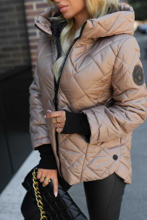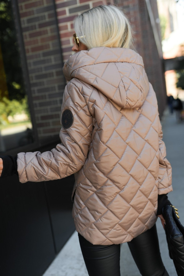 Kurtka pikowana o delikatnie asymetrycznym kroju na okres przejściowy. Zapinana na zamek, wyposażona w praktyczny kaptur chroniący przed chłodem i wiatrem. Na jednym z rękawów umieszczona została ozdobna naszywka, dodająca sportowego charakteru. Po bokach znajdują się napy, które umożliwiają lekką regulację szerokości i wygody noszenia. Rękawy zakończone są długimi ściągaczami, zapewniającymi dodatkową ochronę przed zimnem. Całość dopełnia podszewka, gwarantująca komfort i ciepło w codziennym użytkowaniu.